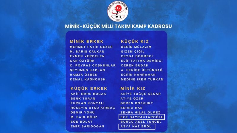 Minik Kızlar Kategorisinde Eskişehir ilinden Eskişehir Yurdum Spor Kulübünden ASYA NAZ EROL ile, Çağdaş kollejliler Spor kulübünden ECE BAYRAKTAROĞLU milli takım kampına davet edilmiştir.